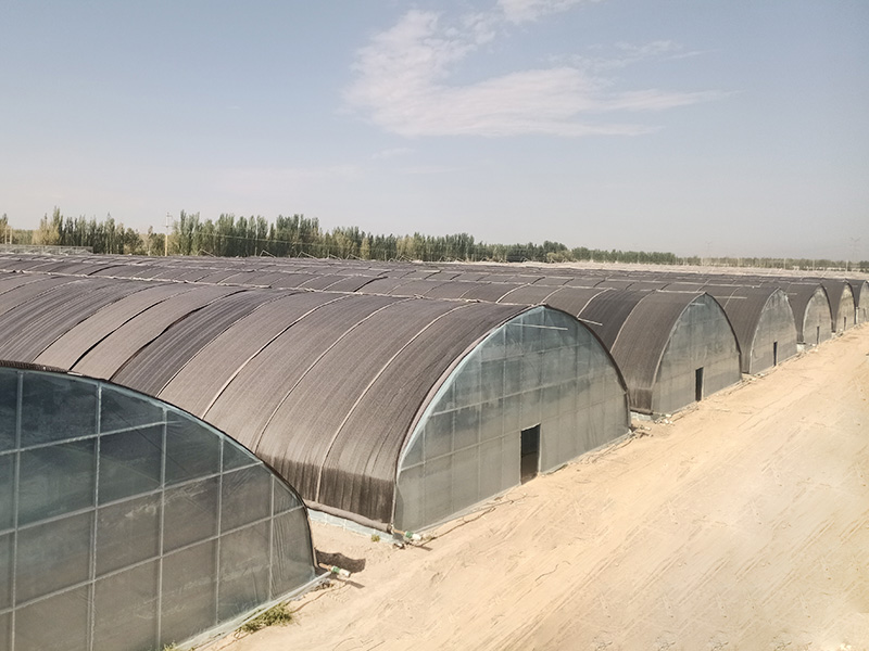 连栋圆拱温室主题钢结构均匀采用热镀锌管材及型材;顶部采用双攻、双层充气膜、单拱单模,四周采用连栋温室专用pep膜、采用聚碳酸酯( PC )中空板覆盖及浮法玻璃(单层、双层),温室的控制系统为集中型电动手控。温室四周为条形基础,内部为独立点式基础,可用于花卉,蔬菜和矮化果树的种植;也可作为育苗温室,用于花卉、蔬菜和树木的育苗;还可以作为观赏型温室,用于生态餐厅、市场展示、观光、科研等;又可以作用水产、畜牧的养殖。